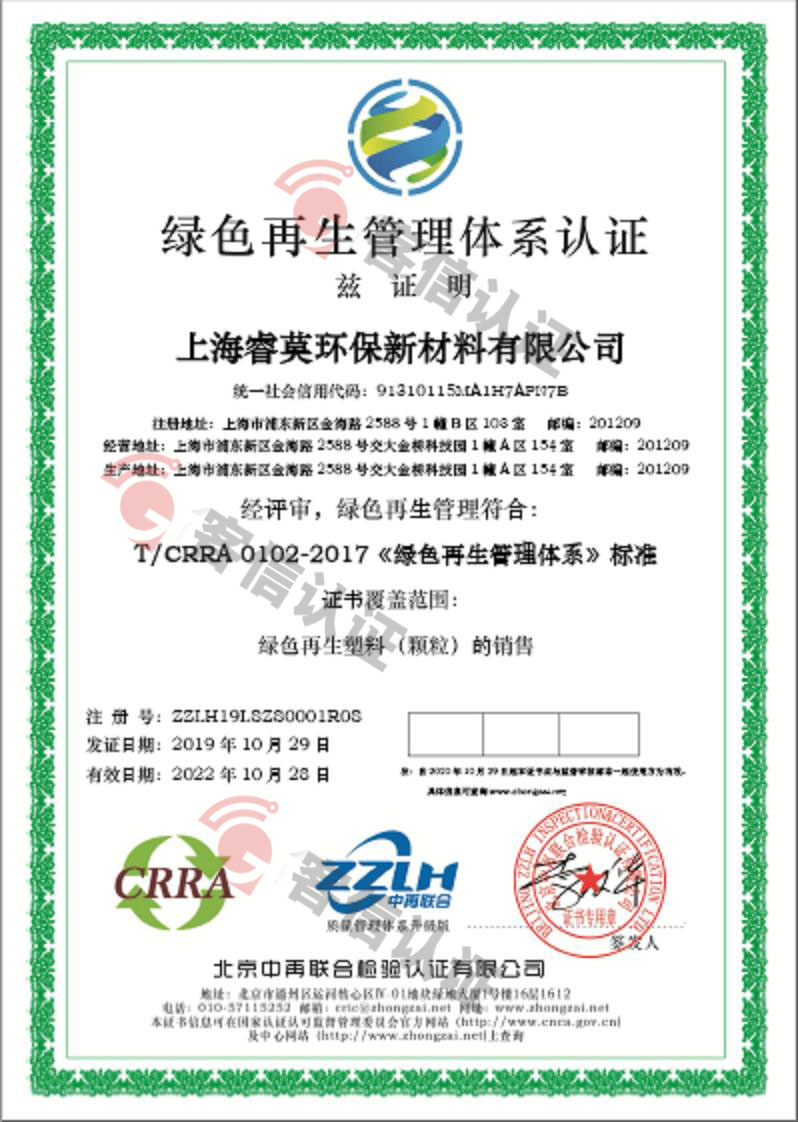 恭喜上海睿英環(huán)保新材料有限公司獲得綠色再生管理體系認證