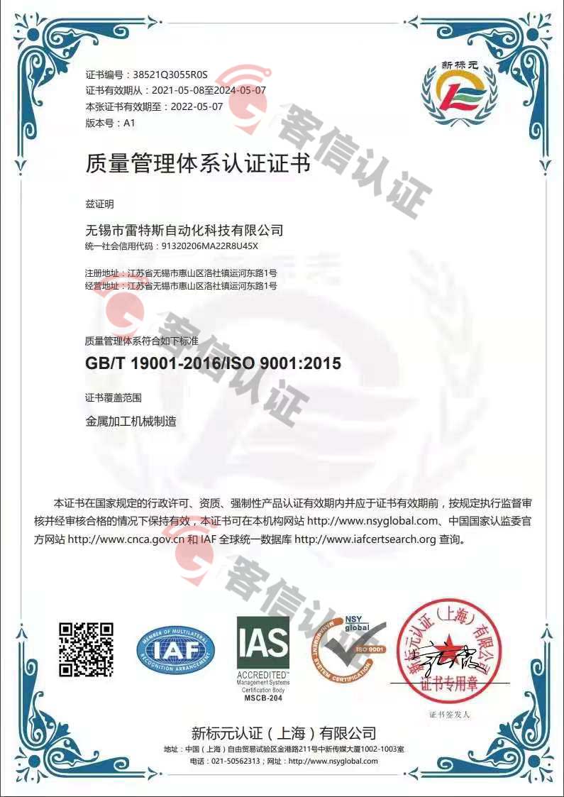 恭喜無錫市雷特斯自動(dòng)化科技有限公司獲取ISO9000質(zhì)量管理體系證書
